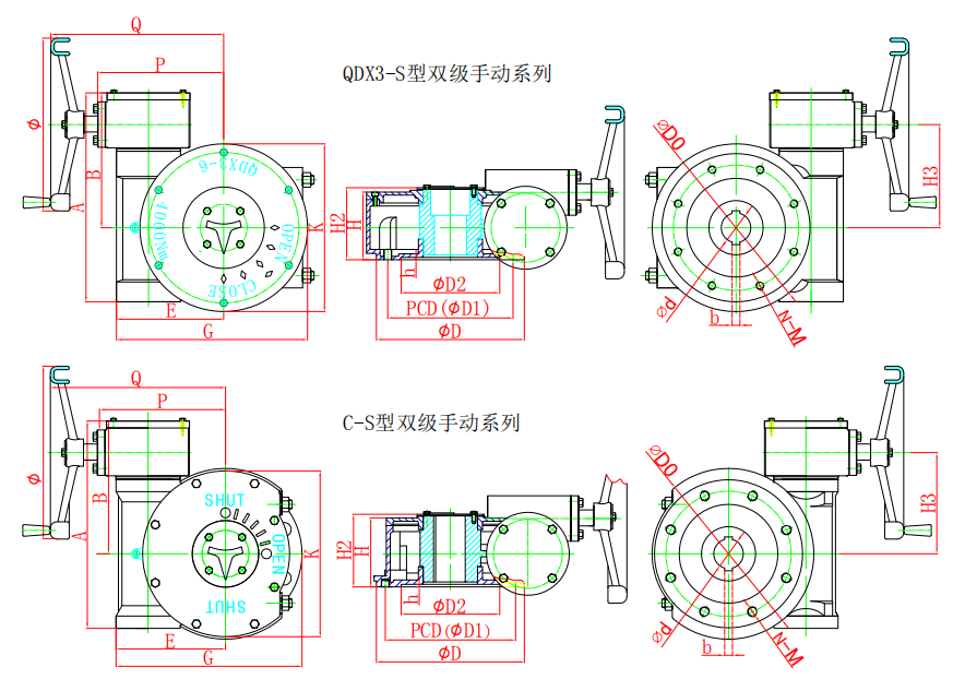 該系列是小蝸輪箱與大蝸輪箱對接組合成為二級傳動蝸輪減速增壓機構(gòu),提高了機械總效率,輸入小力矩,開動大閥門,使操作人員省力,每種型號提供多個傳動比,特殊型可輸出360°無限多回轉(zhuǎn),能更好的匹配不同規(guī)格的閥門。